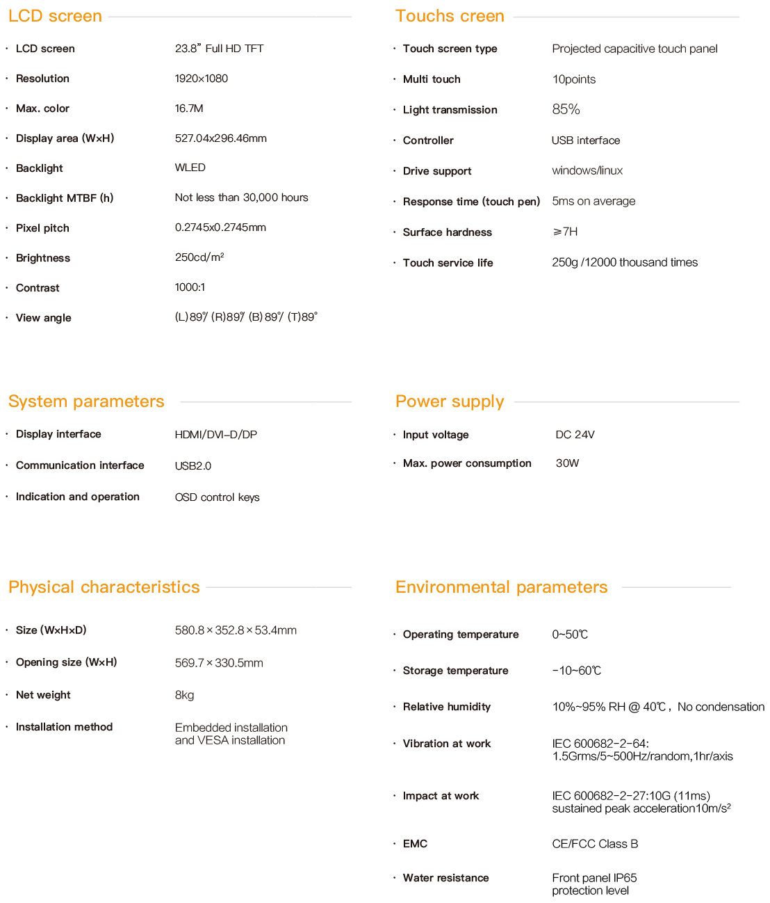 PD-8823 is an embedded ultra-thin industrial touch panel. It is equipped with a 23.8 "high-definition LCD screen with a resolution of 1920x1080 and a projected multi-point capacitive touch screen. It supports three signal transmission interfaces: HDMI, DVI and DP, as well as multiple USB2.0 interface expansions. The maximum communication distance between the PC and the touch panel can reach 30 meters, and the entire machine is powered by DC24V. The front panel has an IP65 protection rating. All interfaces are designed with fastening and have passed CE/FCC certification, making it suitable for demanding human-machine interaction industrial sites.