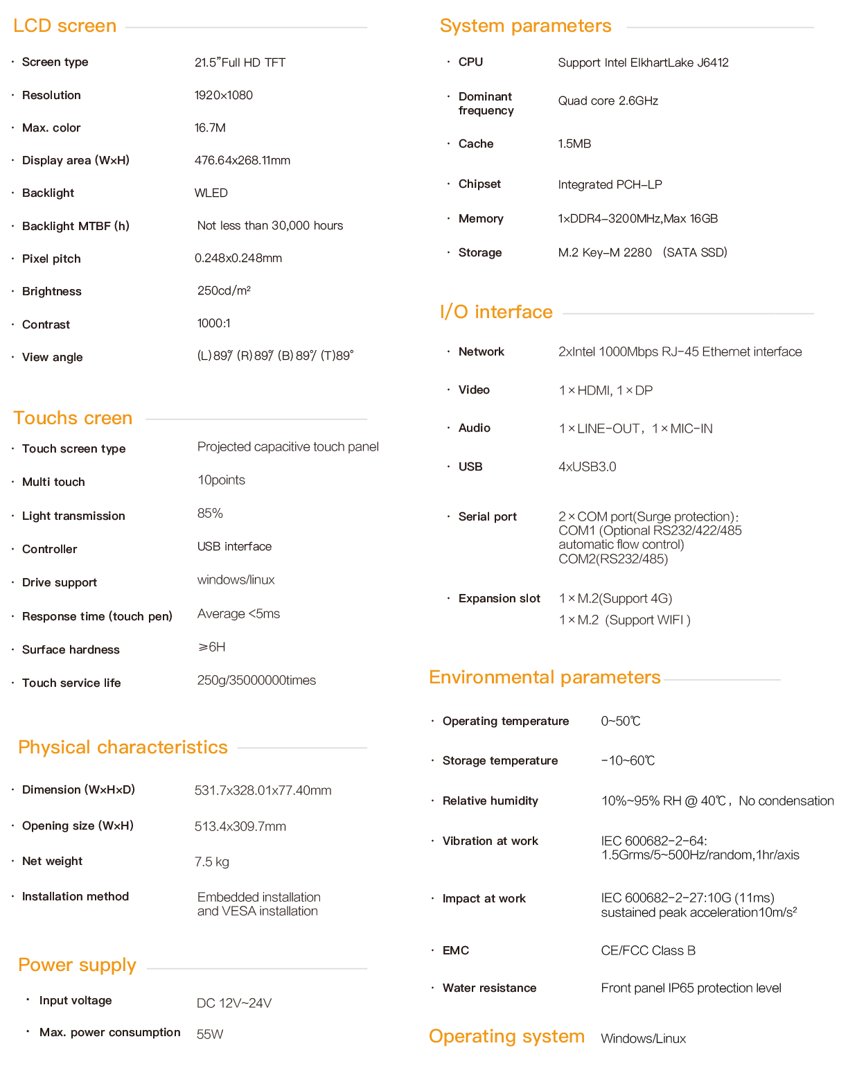 TPC-5621 is an embedded industrial capacitive touch tablet computer. It adopts a fanless and silent design, combining industrial display and touchscreen technology. The product is compact in structure, easy to install and convenient to operate. It is a high-performance and highly reliable industrial computer system. The whole machine adopts a 21.5-inch high-definition LCD screen with a resolution of 1920x1080, featuring rich and delicate colors and a wide viewing Angle. It is powered by a 12-24V wide-voltage DC and is equipped with a round-mouth DC power connector with locking screws to prevent accidental detachment. The touch control adopts a projected capacitive screen and supports 10-point touch simultaneously. The main unit is based on the IntelElkhartLake processing platform CPU, featuring the J6412 processor, equipped with a large-capacity solid-state SSD, DDR4 memory supporting 1x16G capacity, 4xUSB3.0, and dual intel gigabit network cards. The COM1 port supports RS232/422/485, and the COM2 port supports RS232/485. There is one M.2 expansion slot inside for 4G expansion, another M.2 for WIFI expansion, and one HDMI and one DP interface for multi-display mode. The TPC-5621 supports multiple installation methods: hook-mounted embedded installation, VESA-based wall-mounted and cantilevered installation. The front panel complies with the NEMA/IP65 water and dust resistance standard, preventing water splashes from entering during installation in the control cabinet. The high-strength all-steel sealed box structure has the functions of shock resistance and vibration protection. Especially, the specialized EMC design enables the entire machine to have excellent anti-interference ability and be able to adapt to the harsh working environment in industrial sites. It is widely applied in industrial scenarios with strong interference such as factory automation, mechanical manufacturing, numerical control equipment, textile equipment, communication networks and power automation.
