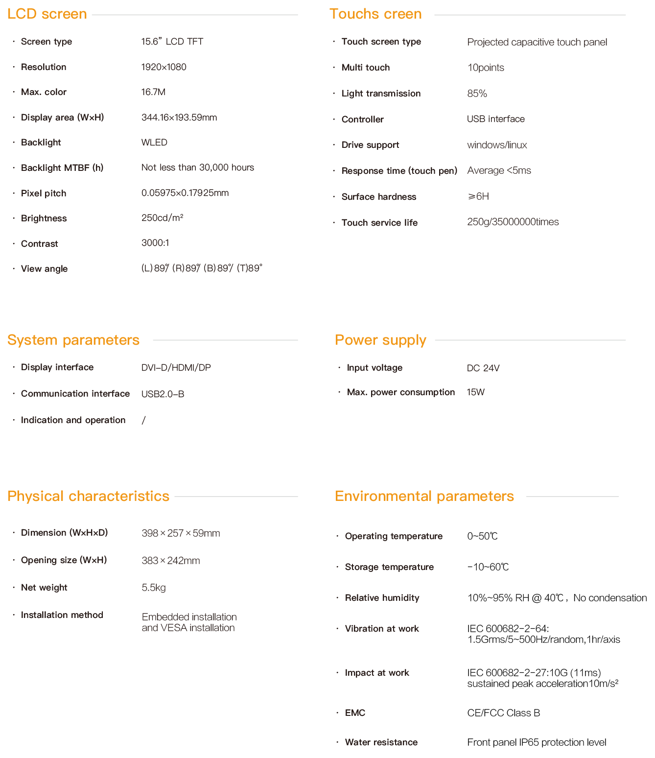 SPD-1500 is an embedded ultra-thin industrial touch panel. It is equipped with a 15.6-inch high-definition LCD screen with a resolution of 1920×1080 and a projected multi-point capacitive touch screen. It supports three signal transmission interfaces: HDMI, DVI and DP, as well as multiple USB interface expansions. The maximum communication distance between the PC and the touch panel can reach 15 meters, and the entire machine is powered by DC24V. The front panel has an IP65 protection rating. All interfaces are designed with fastening and have passed CE/FCC certification, making it suitable for demanding human-machine interaction industrial sites.