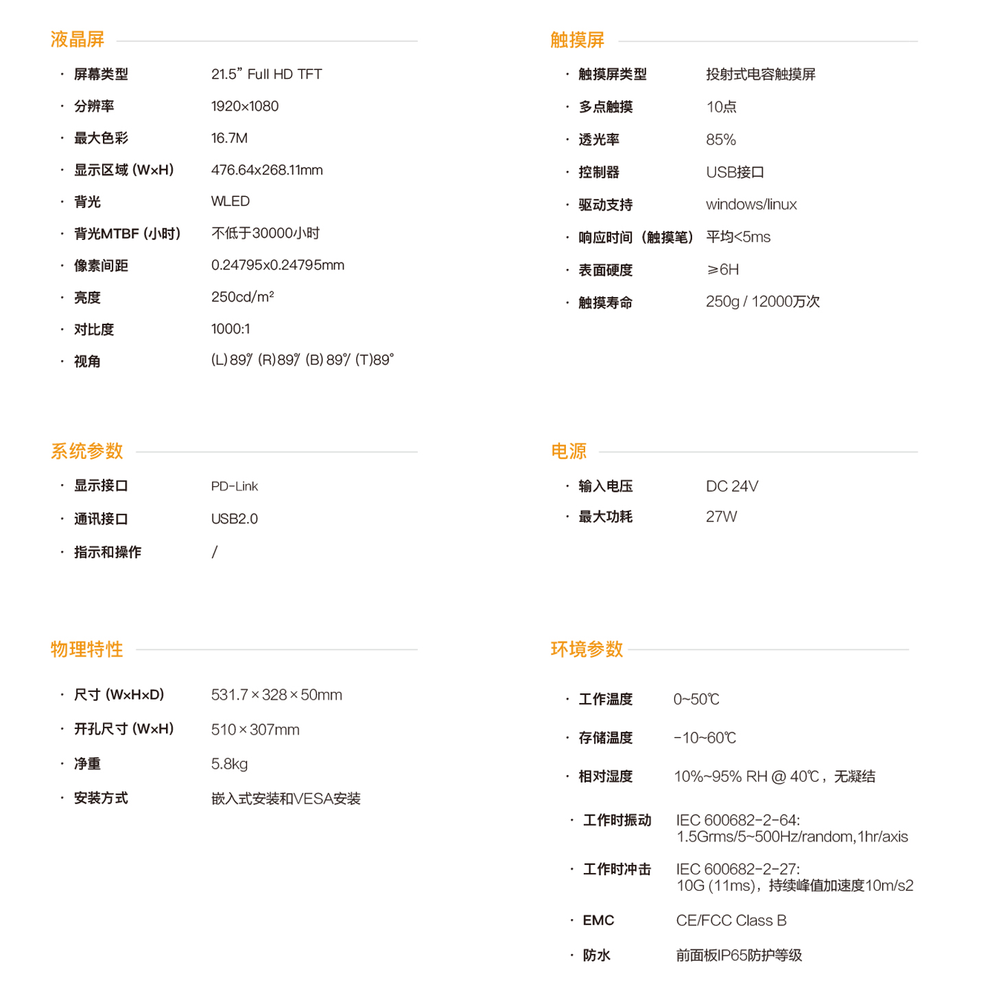 PD-8621是一種高性能工業(yè)遠傳觸控顯示面板,配備21.5”,分辨率為1920x1080的高清液晶顯示屏,支持PD-Link顯示接口;觸控屏幕采用多點投射式電容觸摸屏,。顯示與觸摸部分有特殊抗干擾設(shè)計,可有效抵抗工業(yè)現(xiàn)場大功率電機、伺服等干擾,保證良好的顯示效果與觸控體驗,適應(yīng)各種電磁環(huán)境復(fù)雜的工業(yè)現(xiàn)場。