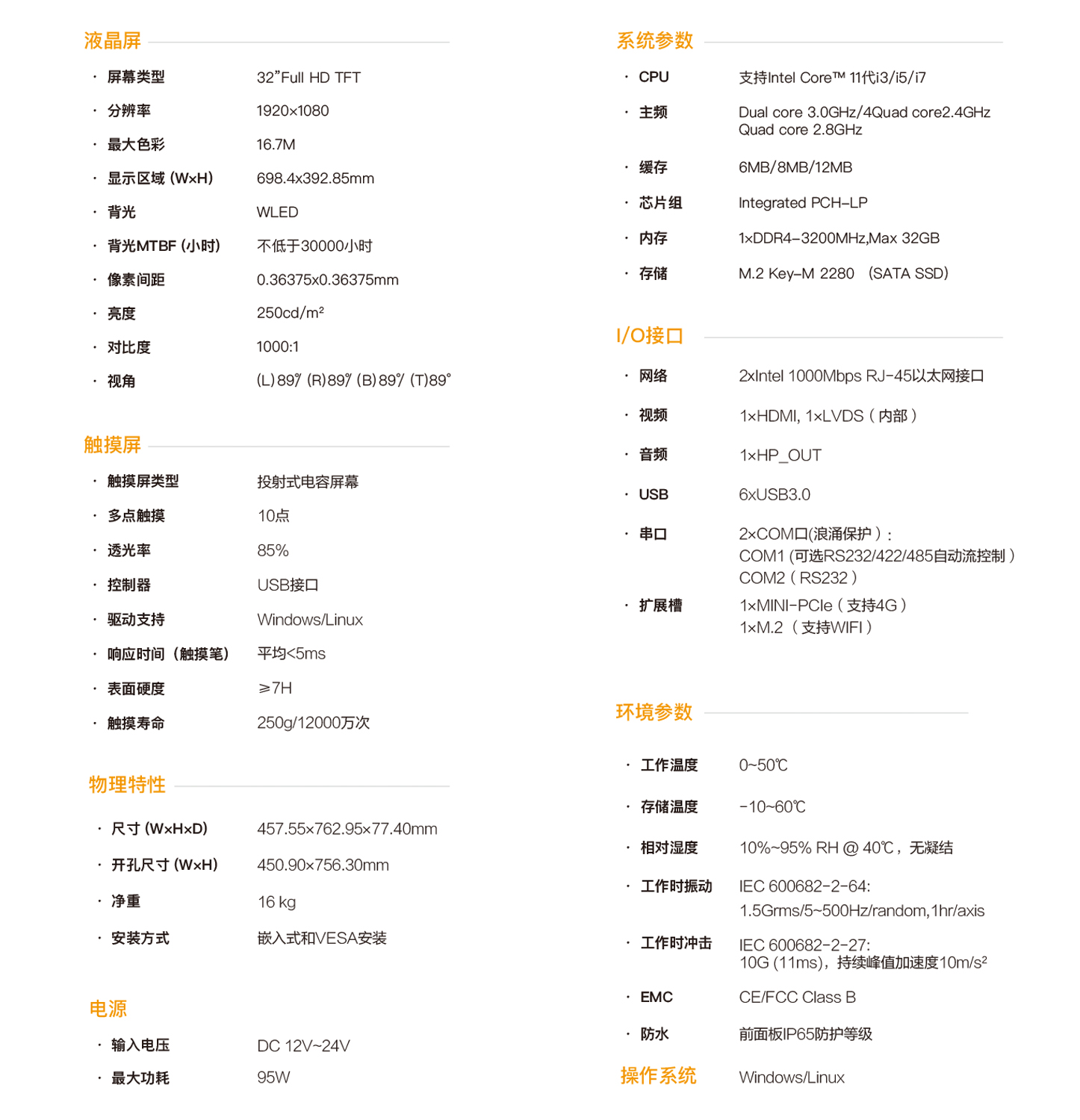 PPC-7632是一款嵌入式工業(yè)型電容觸控平板電腦,采用無(wú)風(fēng)扇靜音設(shè)計(jì),產(chǎn)品構(gòu)成緊湊、易于安裝、操控方便。整機(jī)采用32”分辨率為1920x1080的高清液晶顯示屏,觸控采用多點(diǎn)投射式電容屏。主機(jī)部分采用Intel11代CPU。支持多種安裝方式,專(zhuān)門(mén)的EMC設(shè)計(jì)使得機(jī)器能夠適應(yīng)工業(yè)現(xiàn)場(chǎng)惡劣的工作環(huán)境,廣泛應(yīng)用于各種強(qiáng)干擾工業(yè)場(chǎng)合。