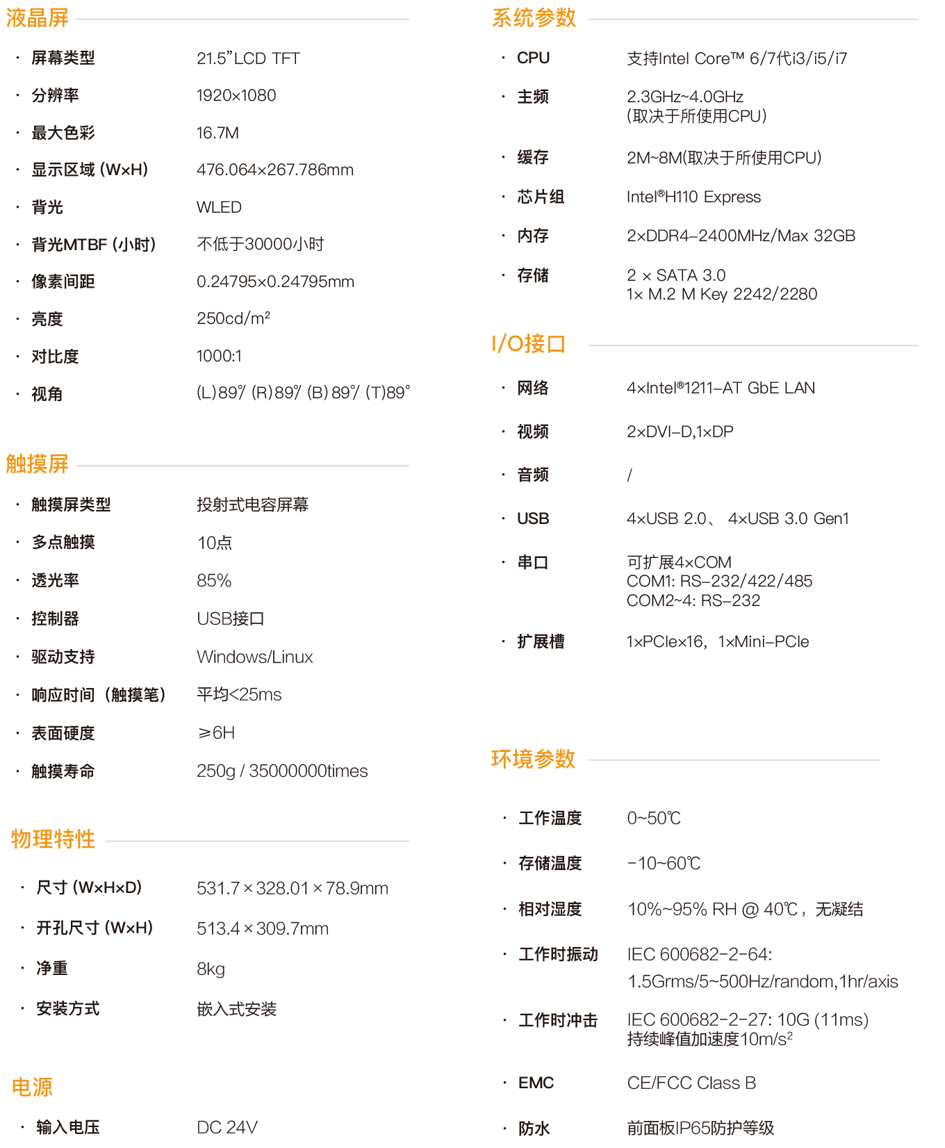 HPC-9621是一款工業(yè)型電容觸控平板電腦,將工業(yè)顯示和觸摸屏技術(shù)相結(jié)合,產(chǎn)品結(jié)構(gòu)緊湊、易于安裝、操控方便,是一款高效能、高可靠的工業(yè)電腦系統(tǒng), 整機(jī)采用21.5寸分辨率為1920*1080的高清液晶顯示屏,色彩豐富細(xì)膩,視角寬闊,24V直流供電,采用投射式10點(diǎn)電容屏,主機(jī)部分搭載Intel Core 6/7代CPU,可配置大容量固態(tài)SSD,內(nèi)存支持最大32G容量。 HPC-9621支持掛鉤式嵌入式安裝,前面板符合IP65防水防塵標(biāo)準(zhǔn),杜絕安裝在控制柜時(shí)因現(xiàn)場(chǎng)飛濺的水滴進(jìn)入,高強(qiáng)度全鋼型箱體結(jié)構(gòu),具有抗沖擊和振動(dòng)防護(hù)功能,尤其是專門(mén)的EMC設(shè)計(jì)使得整機(jī)具有優(yōu)秀的抗干擾能力,能夠適應(yīng)工業(yè)現(xiàn)場(chǎng)惡劣的工作環(huán)境,廣泛應(yīng)用于工廠自動(dòng)化、機(jī)械制造、數(shù)控設(shè)備、紡織設(shè)備、通訊網(wǎng)絡(luò)以及電力自動(dòng)化等強(qiáng)干擾的工業(yè)現(xiàn)場(chǎng)。