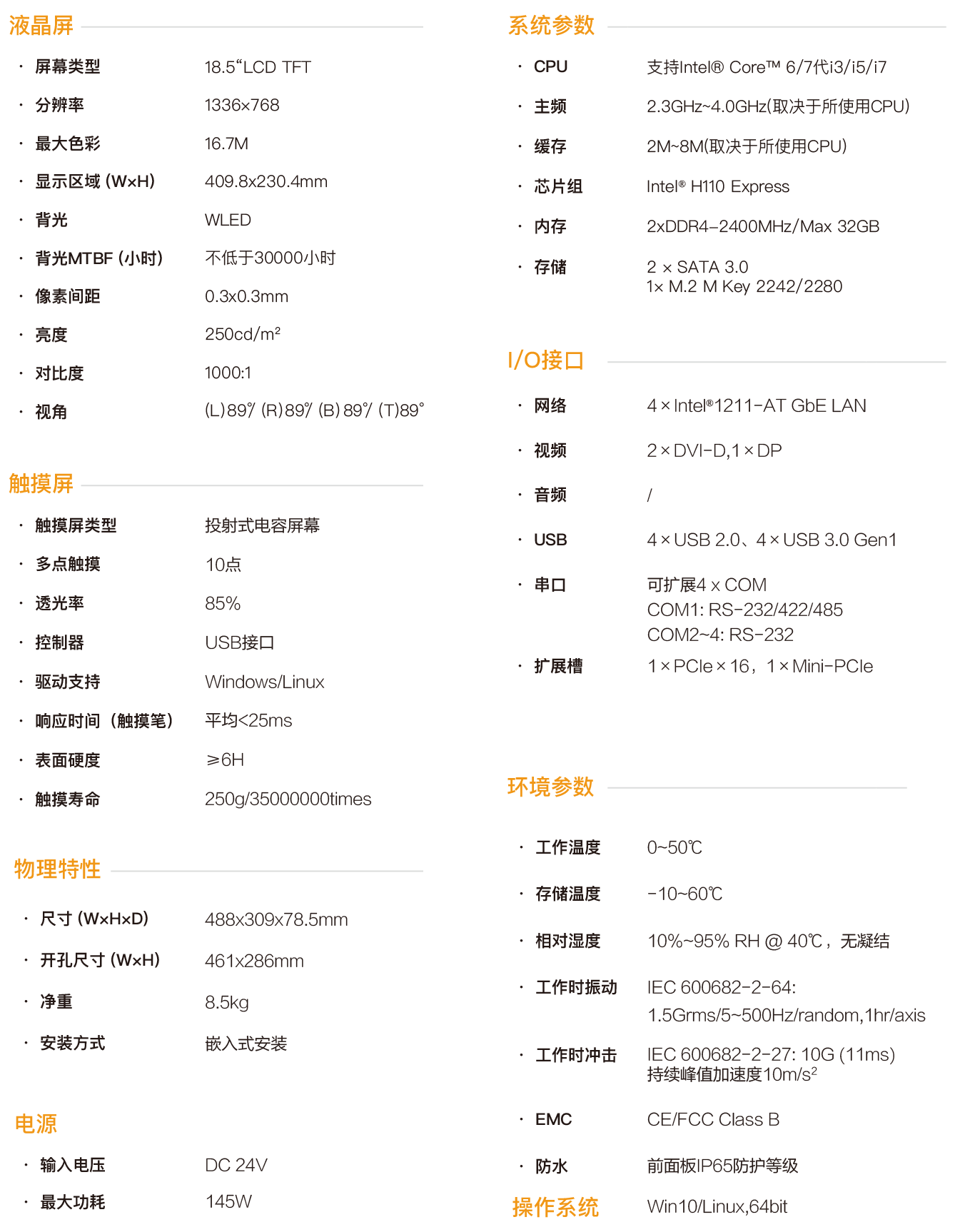 NPC-184i是一款工業(yè)型電容觸控平板電腦,將工業(yè)顯示和觸摸屏技術(shù)相結(jié)合,產(chǎn)品結(jié)構(gòu)緊湊、易于安裝、操控方便,是一款高效能、高可靠的工業(yè)電腦系統(tǒng),整機(jī)采用18.5寸分辨率為1366×768的高清液晶顯示屏,色彩豐富細(xì)膩,視角寬闊,24V直流供電,采用投射式10點(diǎn)電容屏,主機(jī)部分搭載Intel Core 6/7代CPU,可配置大容量固態(tài)SSD,內(nèi)存支持最大32G容量。 NPC-184i支持掛鉤式嵌入式安裝,前面板符合IP65防水防塵標(biāo)準(zhǔn),杜絕安裝在控制柜時(shí)因現(xiàn)場(chǎng)飛濺的水滴進(jìn)入,高強(qiáng)度全鋼型箱體結(jié)構(gòu),具有抗沖擊和振動(dòng)防護(hù)功能,尤其是專門的EMC設(shè)計(jì)使得整機(jī)具有優(yōu)秀的抗干擾能力,能夠適應(yīng)工業(yè)現(xiàn)場(chǎng)惡劣的工作環(huán)境,廣泛應(yīng)用于工廠自動(dòng)化、機(jī)械制造、數(shù)控設(shè)備、紡織設(shè)備、通訊網(wǎng)絡(luò)以及電力自動(dòng)化等強(qiáng)干擾的工業(yè)現(xiàn)場(chǎng)。