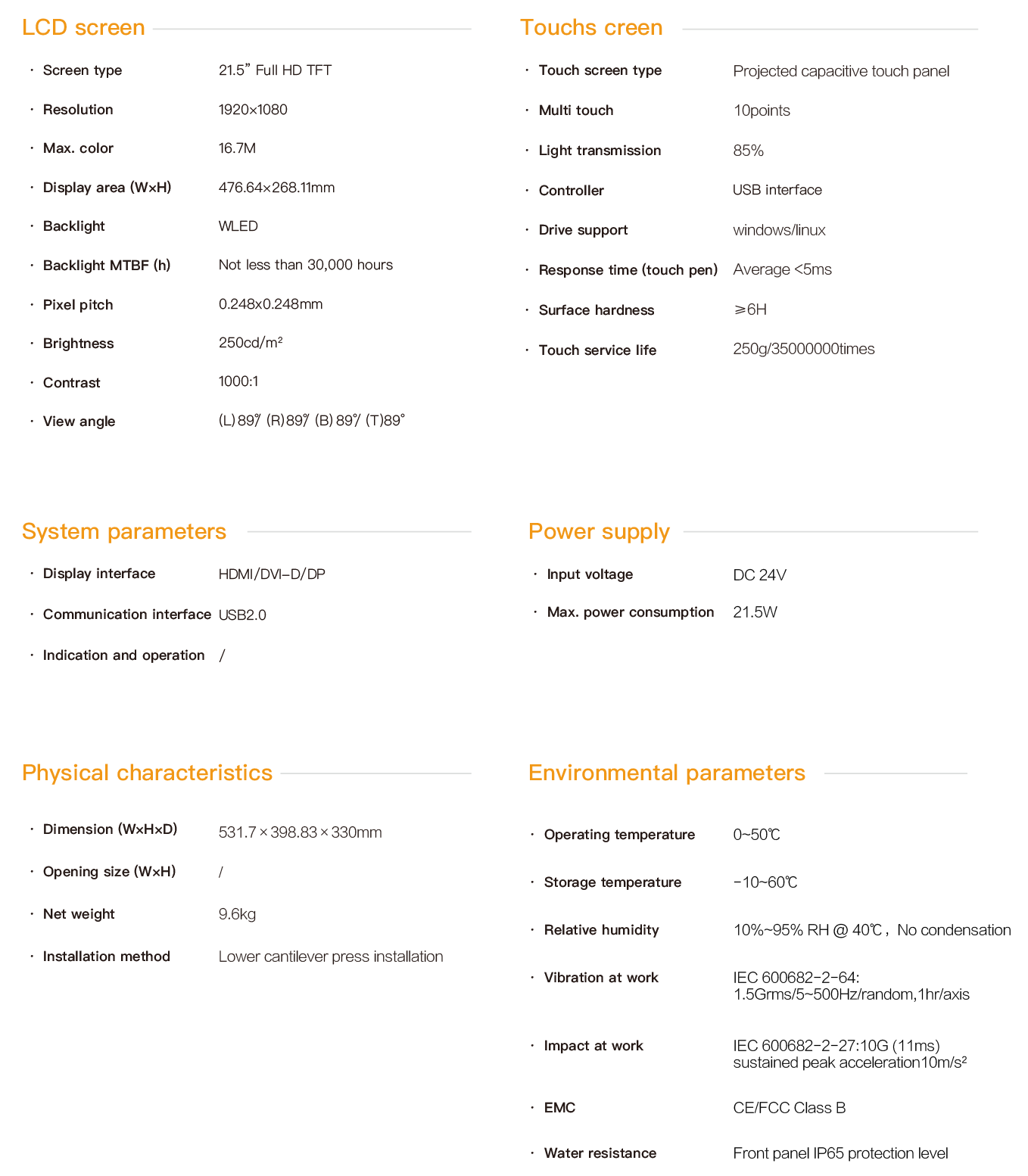 The PDX-3621 is an industrial touch panel with a lower cantilever installation. It features horizontal screen display and is equipped with a keyboard stand. It is configured with a 21.5 "high-definition LCD screen with a resolution of 1920x1080 and a projected multi-touch capacitive screen. It supports three signal transmission interfaces: HDMI, DVI and DP, as well as multiple USB2.0 interface expansions. The maximum communication distance between the PC and the touch panel can reach 30 meters, and the entire machine is powered by DC24V. The front panel has an IP65 protection rating. All interfaces are designed with fastening and have passed CE/FCC certification, making it suitable for demanding human-machine interaction industrial sites.