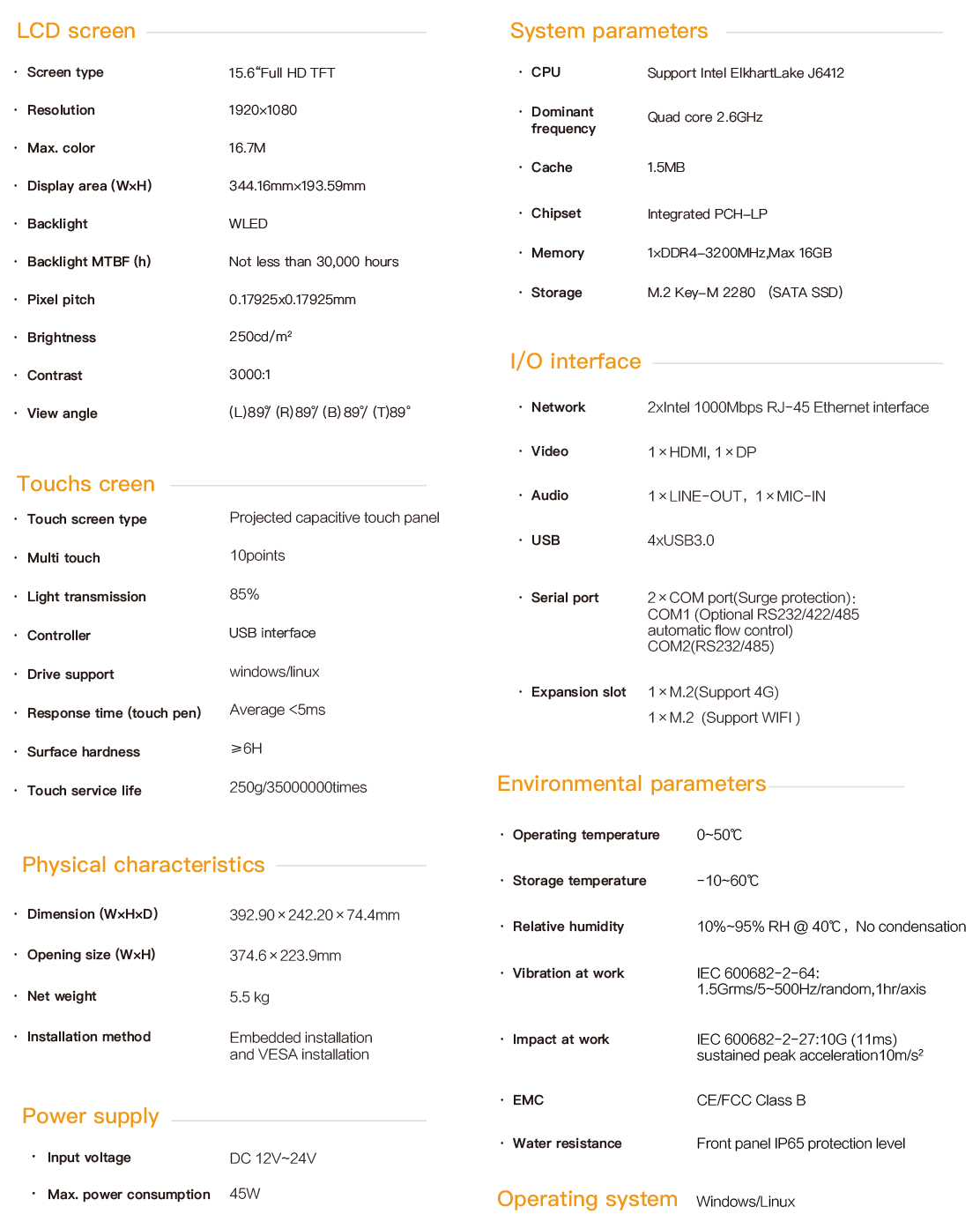TPC-5615 is an embedded industrial capacitive touch tablet computer. It adopts a fanless and silent design, combining industrial display and touch screen technology. The product is compact in structure, easy to install and convenient to operate. It is a high-performance and highly reliable industrial computer system. The whole machine is equipped with a 15.6-inch high-definition LCD screen with a resolution of 1920x1080. Rich and delicate colors, wide viewing Angle, 12-24V wide-voltage DC power supply, and equipped with a round-port DC power connector with locking screws to prevent accidental dropping. The touch screen adopts a projected capacitive screen and supports 10-point touch. The main unit is based on the IntelElkhartLake processing platform CPU and uses the J6412 processor. It is equipped with a large-capacity solid-state SSD, DDR4 memory supporting 1×16G capacity, 4×USB3.0, dual intel Gigabit network cards, COM1 port supporting RS232/422/485, COM2 port supporting RS232/485, one M.2 expansion slot inside for 4G expansion, and another M.2 for WIFI expansion One HDMI and one DP interface are used for multi-display mode. TPC-5615 supports multiple installation methods: Hook-type embedded installation, wall-mounted and cantilevered installation based on VESA. The front panel complies with NEMA/IP65 waterproof and dustproof standards, preventing water droplets from entering due to on-site splashing when installed in the control cabinet. The high-strength all-steel sealed box structure has anti-impact and vibration protection functions. Especially, the dedicated EMC design endows the entire machine with excellent anti-interference capabilities, enabling it to adapt to the harsh working environments in industrial sites. It is widely used in industrial Settings with strong interference such as factory automation, mechanical manufacturing, CNC equipment, textile equipment, communication networks, and power automation.