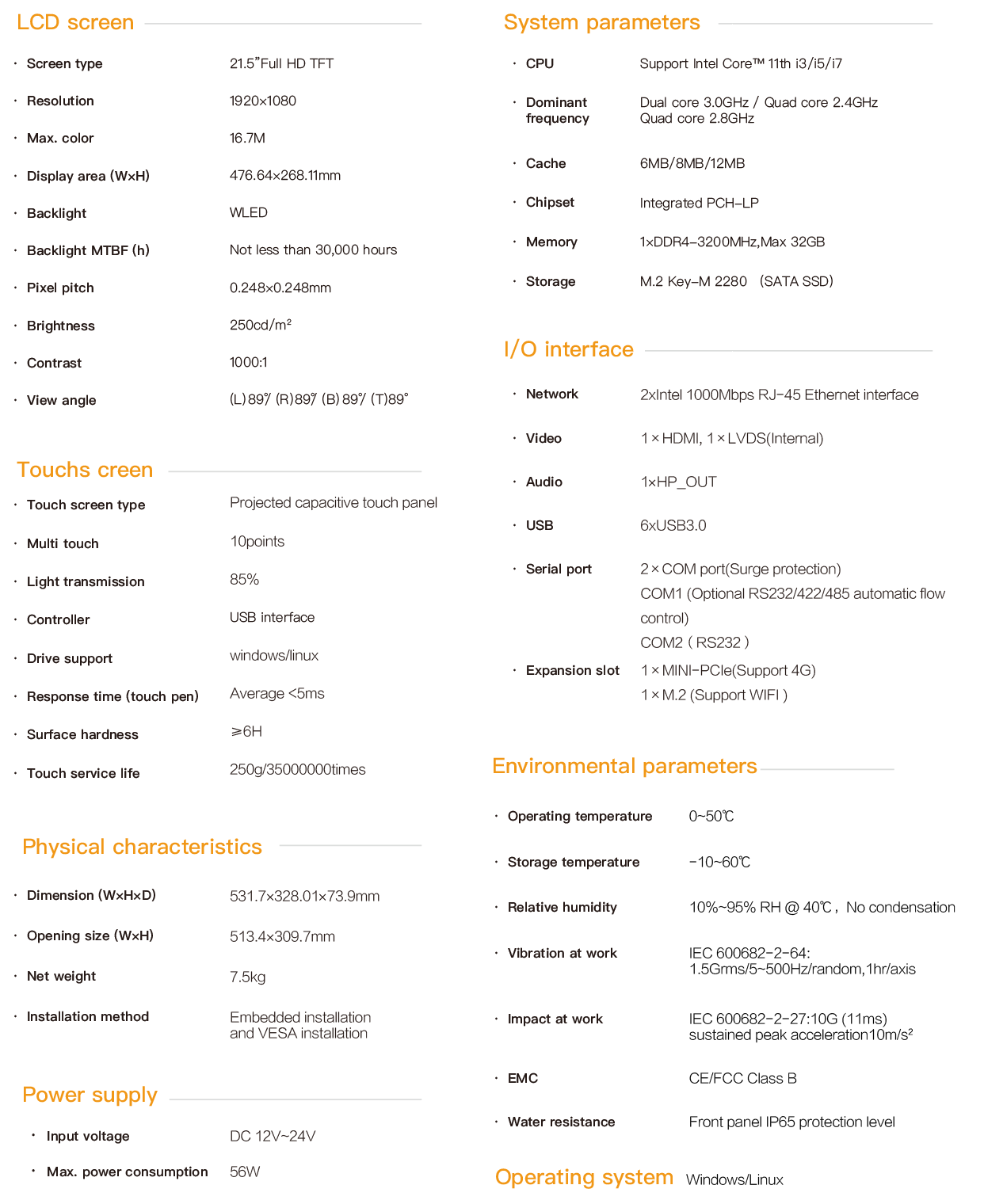 The PPC-7621 is an embedded industrial capacitive touch tablet computer. It adopts a fanless and silent design, combining industrial display and touchscreen technology. The product is compact in structure, easy to install and convenient to operate. It is a high-performance and highly reliable industrial computer system. The whole machine adopts a 21.5-inch high-definition LCD screen with a resolution of 1920x1080, featuring rich and delicate colors and a wide viewing Angle. It is powered by a 12-24V wide-voltage DC and is equipped with a round-mouth DC power connector with locking screws to prevent accidental detachment. The touch control adopts a projected capacitive screen and supports 10-point touch simultaneously. The main unit is equipped with an Intel 11th generation CPU and a large-capacity solid-state SSD. DDR4 memory supports a capacity of 1×32G and 6×USB3.0. Dual intel gigabit network cards. COM1 supports RS232/422/485, and COM2 port supports R232. The internal MINI-PCIe and M.2 expansion slots facilitate I/O expansion for 4G, WIFI, etc. The PPC-7621 supports multiple installation methods: hook-mounted embedded installation, VESA-based wall-mounted and cantilevered installation. The front panel complies with the NEMA/IP65 water and dust resistance standard, preventing water splashes from entering during installation in the control cabinet. The high-strength all-steel sealed box structure has the functions of shock resistance and vibration protection. Especially, the specialized EMC design enables the entire machine to have excellent anti-interference ability and be able to adapt to the harsh working environment in industrial sites. It is widely applied in industrial scenarios with strong interference such as factory automation, mechanical manufacturing, numerical control equipment, textile equipment, communication networks and power automation.