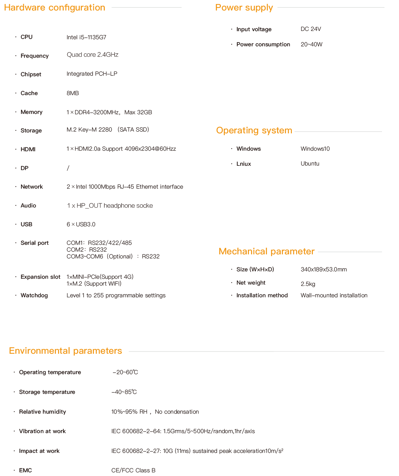 EPC-2852 is a fanless industrial computer based on the high-performance Intel?Intel Core i5-1135G7 processor. Supports HDMI display interface. The product is equipped with rich I/O interfaces and has 2 Intel GbE gigabit network ports. 6 USB3.0 ports,4 optional USB2.0 interfaces,1 RS232/RS422/RS485 port,1 RS232 port,4 optional RS232 serial ports. One 1× mini-CLE expansion slot for expanding 3G/4G modules, one ×M.2 expansion slot for expanding wireless WIFI, one M.2 hard disk interface for supporting SATA protocol SSD. The system IO interface is equipped with an EMC circuit to ensure the reliability of the product and a lower failure rate. The product features an exquisite and robust design. The large area of aluminum fins quickly dissipates the heat from the processor. The fanless and fully enclosed structure effectively prevents dust from entering, ensuring reliable long-term operation in harsh industrial environments. The whole machine is powered by DC12V to 24V. All interfaces are designed to be fastened tightly and have passed CE/FCC certification. It can be applied to harsh industrial sites. The operating system supports Windows10 and Linux.