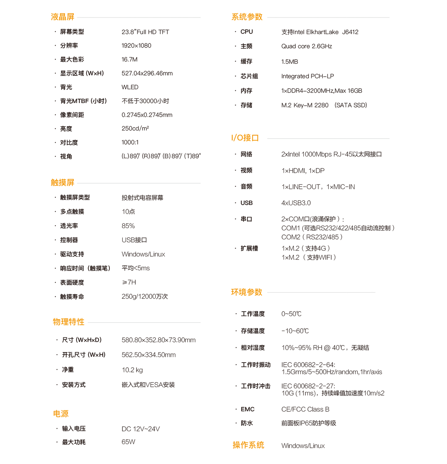 TPC-5623是一款嵌入式工業(yè)型電容觸控平板電腦,采用無風(fēng)扇靜音設(shè)計(jì),產(chǎn)品構(gòu)成緊湊、易于安裝、操控方便。整機(jī)采用23.8”分辨率為1920x1080的高清液晶顯示屏,觸控采用多點(diǎn)投射式電容屏。主機(jī)部分基于Intel ElkhartLake處理平臺(tái)CPU,采用J6412處理器。支持多種安裝方式,專門的EMC設(shè)計(jì)使得機(jī)器能夠適應(yīng)工業(yè)現(xiàn)場(chǎng)惡劣的工作環(huán)境,廣泛應(yīng)用于各種強(qiáng)干擾工業(yè)場(chǎng)合。