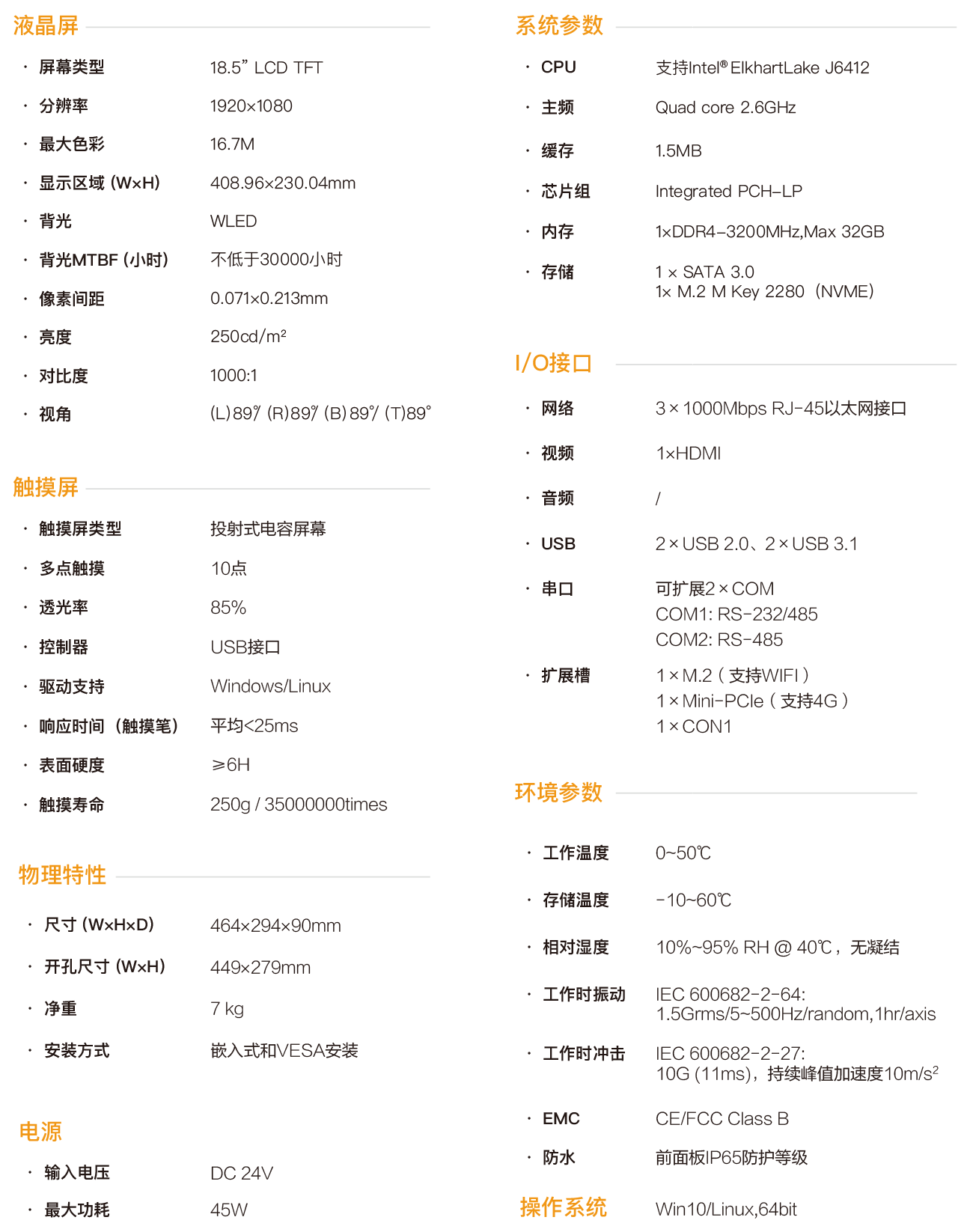 SPC-4719L是一款嵌入式工業(yè)型電容觸控平板電腦,采用 無風扇靜音設計,將工業(yè)顯示和觸摸屏技術相結合,產(chǎn)品構成緊 湊、易于安裝、操控方便,是一款高效能、高可靠的工業(yè)電腦系 統(tǒng), 整機采用18.5寸分辨率為1920x1080的高清液晶顯示屏,色 彩豐富細膩,視角寬闊,12~24V寬壓直流供電,觸控采用投射 式電容屏,同時支持10點觸摸,主機部基于Intel ElkhartLake處 理平臺CPU,采用J6412處理器,配置大容量固態(tài)SSD, DDR4 內存支持1×32G容量,4×USB接口, 3個intel千兆網(wǎng)卡,可擴展2 個COM口,COM1口支持RS232/422/485,COM2口支持 RS232/485,內部1個Mini-PCIe擴展插槽可支持4G擴展,1個 M.2用于WIFI,1個HDMI接口用于多顯示器模式。 SPC-4719L支持多種安裝方式:掛鉤式嵌入式安裝,基于 VESA的壁掛式和懸臂式安裝,前面板符合 NEMA/IP65 防水防 塵標準,杜絕安裝在控制柜時因現(xiàn)場飛濺的水滴進入,高強度全 鋼型密封箱體結構,具有抗沖擊和振動防護功能,尤其是專門的 EMC設計使得整機具有優(yōu)秀的抗干擾能力,能夠適應工業(yè)現(xiàn)場 惡劣的工作環(huán)境,廣泛應用于工廠自動化、機械制造、數(shù)控設備、 紡織設備、通訊網(wǎng)絡以及電力自動化等強干擾工業(yè)場合。